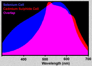 | The following illustration compares the spectral ranges for a selenium cell and a cadmium sulfide cell. The selenium cells is a better match for the visual spectrum and for ultraviolet. (This selenium sensitivity curve does not exactly match the one shown above for the Weston meter which uses a selenium cell.) The cadmium sulfide cell is better for infrared measurements than the selenium cell. Its sensitivity curve extends further into the infrared region. |