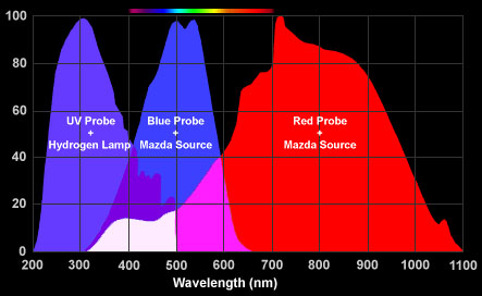 | Traditional photo multiplier tubes and newer semiconductor sensors have sensitivity bandwidths which cover the entire range of wavelengths of interest with photography. The following plot show the sensitivity range of the Densichron densitometer which uses a photo multiplier tube. |