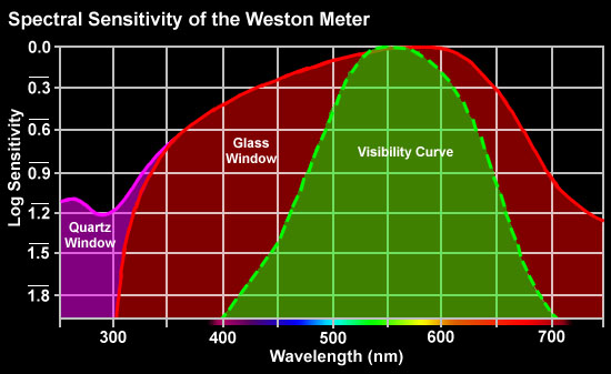 | If the Weston meter is fitted with a glass cover nearly all of the ultraviolet light below 300 nm is filtered out. A quartz cover allows limited sensitivity to below 250 nm. Sensitivity is down by about 4 f-stops in both the ultraviolet (250 nm) and the infrared (750 nm) regions. This makes it possible to use a photographic exposure meter to determine exposure settings for photography beyond the visual spectrum. Testing is required to determine an adjusted film speed setting to use for either ultraviolet or infrared exposure determination. The film speed adjustment should be about 4 f-stops plus some extra compensation for the UV or infrared passband filter placed over the Weston cell to eliminate other portions of the spectrum. |